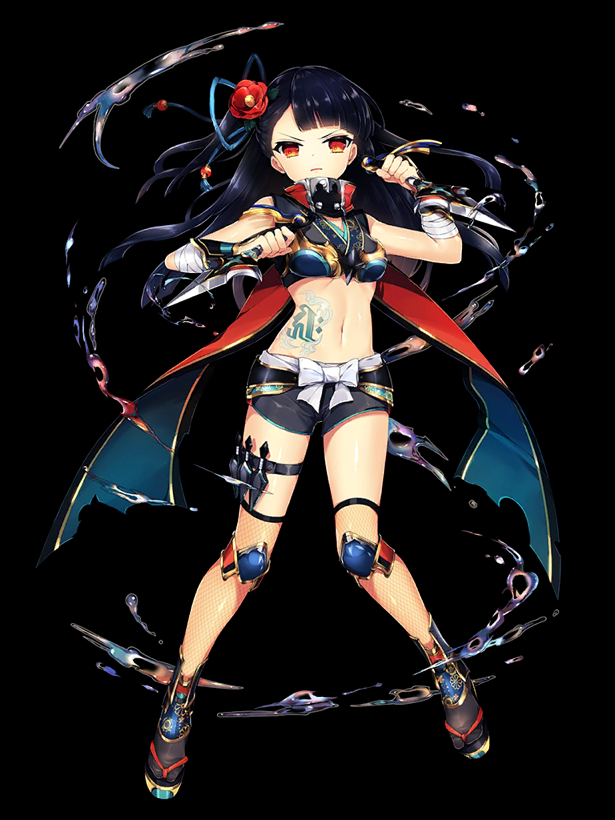 はるか東方の国出身の女忍者。 ある事情から国を追われ、抜け忍となり逃れてきた。 騎士団ではアンナマリーのボディーガードを務めている。 陽気な性格だが、戦いになると鍛えられた忍術で無情に戦う。
