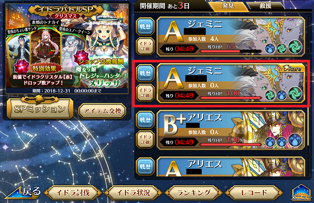 救援要請イドラ討伐で戦闘後もイドラが生き残った場合にフレンド、所属旅団、ゲストに救援要請が送ることができる。 イドラ化自分の持つキャラクターを編成し、イドラコア?を消費してイドラ化する。 その他の特徴は下記の通り。