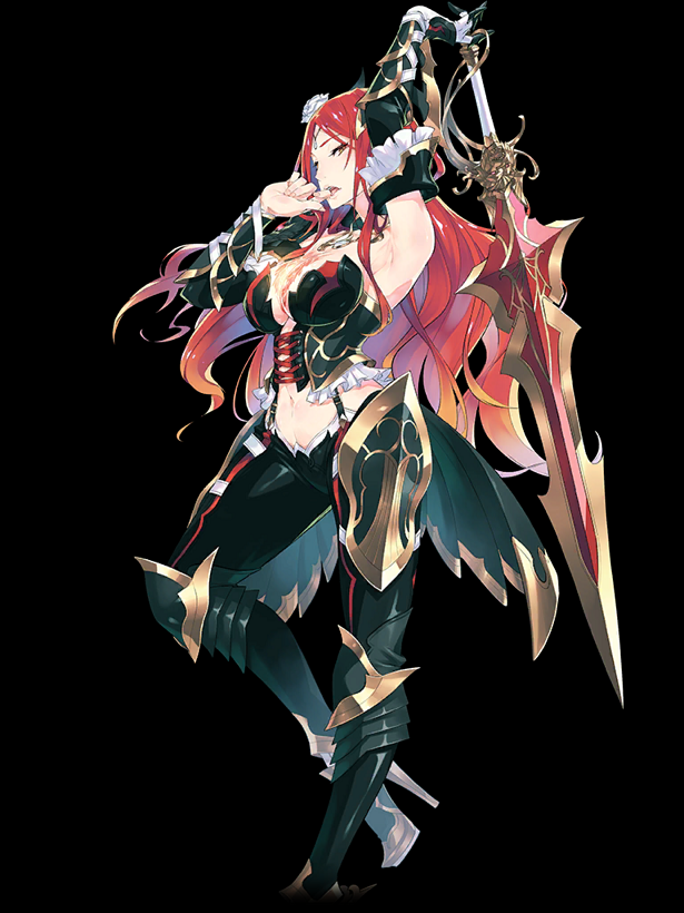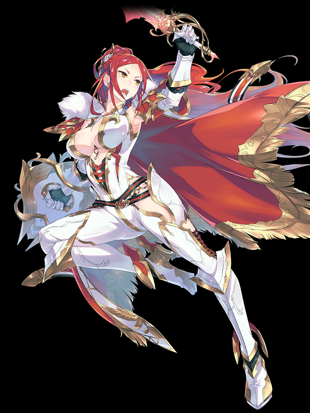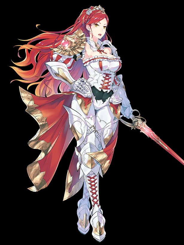 初期実装の☆5ナイト。姫騎士。くっ殺って言わせたくなる。 通常・スキル2・EBのどれも対単体のため、ボス戦で真価を発揮する。 スキル1は庇う+カウンタースキル。同系統のスキルを持つヴァルターと比べ、スキル1なので早い段階から使いやすいのが便利。 スキル2は最終で敵単体に攻撃+付与率の高い燃焼付与のスキル。攻撃を受けると威力に補正が乗るので敵に範囲攻撃持ちが多い時に真価を発揮する。 EBは敵単体に攻撃しつつ高確率の業火を付与。属性消費も7と軽いので連発が効き、業火のダメージによって数値以上の火力が出る。 通常3とスキル1で燃焼・EBで業火を付与するので状態異常特攻持ちと相性が良い。